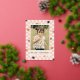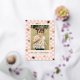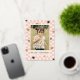 Une carte de la Saint-Valentin en papier peint avec des coeurs bronzés éparpillés sur un damier rose. Le message et l'information du client sont placés sous une grande photo, et le dos de la carte comporte un motif de coordination.