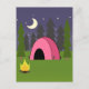Une invitation de carte postale d'anniversaire avec une illustration d'une tente rose dans les bois la nuit avec un feu de camp. Personnalisez tout le texte.