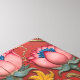 Three pink lotus flowers with blue pistils and yellow leaves on a red background with a golden frame, art nouveau style.