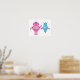 Ein lustiges Wandkunstposter, das sich perfekt für ein Kinderzimmer- oder Kinderzimmer eignet. Das Design besteht aus zwei niedlichen und freundlichen Robotern in Rosa- und Türkisblau. Ein schwenkbarer Roboter mit BEEP auf seinem Bildschirm steht neben einem fliegenden Roboter. Das Poster hat einen weißen Hintergrund.