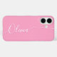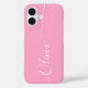 Pink Elegant White Calligrafy Script Custom Personalisiert Name iPhone 16 Smart Phone Cases bietet ein modernes und trendige, einfache und stilvolle Design mit Ihrem personalisierten Namen in eleganten handgeschriebenen Kalligraphieskripttypografie auf einem rosa Hintergrund. Entworfen von ©Evco Studio www.zazzle.com/store/evcostudio