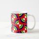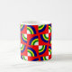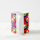 Diese Tasse hat ein Bauhaus-Design aus Viertelkreisen in blau, gelb, grün und weiß auf einem roten Feld.