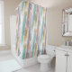 Ein lebendiger und moderner abstrakter Duschvorhang mit vertikalen Pinselstrichen in sanften Pastelltönen - rosa, lila, aquamarin und beige - mit spielerischen geometrischen Elementen. Dotted Ovale und Teardrops bringen kühne Kontrast, während texturierte goldene Kreise und verstreute goldene Punkte funkeln und Bewegung. Dieses nahtlose Design verbindet malerische Texturen mit strukturierten Akzenten, ideal für diejenigen, die in expressive, künstlerische und zeitgenössische Ästhetik gezeichnet werden.
