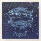 Untersetzer aus Glas mit dem Zodiaksymbol für Pisces in weichem silberblauem Weiß, überlagert mit den Sternen der Sterne, vor einem Sternenhimmel, der von tiefblauem Mitternachtsblau bis schwarz gestuft wird.
