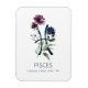Modernes, blumengeschmücktes Design des Pisces Zodiac-Symbols, das zwei Fische zeigt, die in entgegengesetzte Richtungen schwimmen. Die Glyphe repräsentiert die ständige Trennung von Pisces Aufmerksamkeit zwischen Fantasie und Realität.