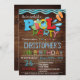 Invitation de Pool Party pour les garçons. Invitation de la piscine sur un arrière - plan en bois avec des éléments colorés de la piscine d'été, des vagues d'eau bleue et du beach-ball. Parfait pour une fête d'anniversaire à l'extérieur avec des amis proches.