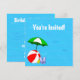 Invitations personnalisées sur le thème de la piscine, décorées d'une boule de plage rouge, d'un parapluie vert, de sandales et d'huile de bronzage sur un arrière - plan bleu aquatique aux vagues ondulées. Cliquez sur Customiser pour modifier les polices ou les couleurs.