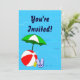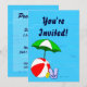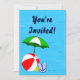 Invitations personnalisées sur le thème de la piscine, décorées d'une boule de plage rouge, d'un parapluie vert, de sandales et d'huile de bronzage sur un arrière - plan bleu aquatique aux vagues ondulées. Cliquez sur Customiser pour modifier les polices ou les couleurs.