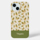 Ein Gehäuse mit einem Muster von Pistachios und grüner Polka zeigt auf einem hellbraunen Hintergrund und am unteren Ende einen anpassbaren Vornamen oder Text Ihrer Wahl auf grünem Hintergrund. Ein hübsches Geschenk für einen Freund, der sich die Liebe verführt.