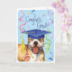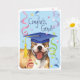 Begrüßen Sie Ihren Lieblingsschüler mit einem niedlichen, glücklichen amerikanischen Pit Bull Terrier-Absolvent mit einem Mörtel inmitten einer Flasche Konfetti.