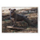Auf dieser Karte steht: "Willkommen Zuhause." Darin steht: "Jetzt, lasst uns SPIELEN!" Eine bezaubernde Karte mit einem hübschen Blue Nose Pitbull namens Sarge. Sarge ist stehend mit seinen zwei Vorderpfoten auf seinem Lieblingsspielzeug, einem Skateboard. Seine Hinterbeine sind ausgestreckt und seine Ohren sind hoch und wachsam, denn dieser hübsche Hund sieht dich in perfekter Pose an.