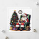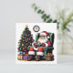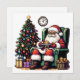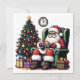 Personalisierte Weihnachtskarte mit einem Gaming-Ambiente. Der Weihnachtsmann isst am Weihnachtsabend neben einem Weihnachtsbaum Schokoladenkekse. 8-Bit-Gaming-Vibes.