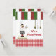 Niedliche Pizza-Party Einladung mit dem italienischen Koch, der auf Rollen-Button- und -küchengeräten mit Rot stehend ist, überprüfte untere Grenze und rotes, weißes und grünes gestreiftes, um einzufassen.