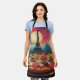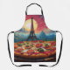 Eine große Pizza mit lebhaften Pepperoni-Scheiben und Grünpflanzen ist Set vor einem Eiffelturm, mit einem majestätischen Sonnenuntergang und Bergen im Hintergrund. Helle, skurrile Farben schaffen eine surreale und fantastische Szene, die Natur und kulinarische Kunst miteinander verbindet.