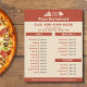 Ein Flyer in Beige- und Rotbraun mit Speisekarte und Preisliste für Pizzeria, Restaurant, LKW, Zuhause-Delivery oder Cooking-Koch, illustriert mit einem Stück Pizza, einem Koch Hut und einem Gebäude. Sie können sie an Ihre Kunden oder in Mailboxen verteilen. Texte sind vollständig anpassbar!