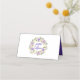 Le design floral violet est parfait pour un mariage de printemps ou d'été. En plus des fleurs violettes profondes, il y a des fleurs plus petites rose pâle et blanc ivoire doux. Les feuilles sont variés et donnent au design floral une qualité légère et aérée. Les noms des couples mariages sont écrits dans un magnifique script formel en violet et entourés d'une luxuriante couronne fleurie. Le reste du texte est une police noire élégante. L'avant de la carte de place du mariage a une ligne pour le nom du client et un espace pour le numéro de table. Le verso de la carte est l'endroit où les noms du couple mariage sont écrits.