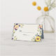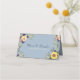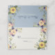 Elégante, moderne, boho, rustique, botanique, bleu poussiéreux carte de mariage avec nom et numéro de table, fleurs d'aquarelle, tournesols et verdure.