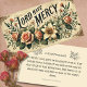 Doté d'une belle image vintage de roses floraux avec les mots "SEIGNEUR A MERCY". dans un style calligraphie vintage. Au fond, il y a la prière : "Ô Seigneur Miséricordieux, donne-nous la grâce de faire confiance à Ta miséricorde infinie. En temps de procès et de tristesse, que nous trouvions refuge dans Votre coeur affectueux. Ayez pitié de nous, guidez nos pas, et gardez-nous toujours près de Vous. Amen."