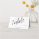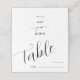 Carte d'emplacement de numéro de table simple et minimale pour votre mariage avec une police de script moderne qui dit "table" avec une ligne vide où vous pouvez remplir le numéro de table et le nom de l'invité. Vous pouvez ajouter les noms de la mariée et du marié à l'arrière.
