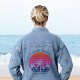 Cool jumelant vestes de denim vacances familiales pour femmes à porter sur une croisière île. Doté de beaux palmiers face à un joli coucher de soleil de plage rose. Veste en jean personnalisée pour votre séjour d'été à la mer.
