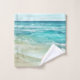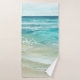 Créez une ambiance de spa et de vacances en bord de mer avec cette serviette de bain côtière cool avec aquarelle tropicale turquoise et vagues de l'océan de mer, étoiles de corail et "la plage est mon endroit heureux" légende dans une écriture marine bleu marine. Art par KL Stock