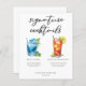 Cette carte de cocktails chic et signature de plage propose une typographie noire simple au-dessus de 2 boissons balnéaires et leurs ingrédients pour votre bar mariage côtier. Un joli dessin de thé glacé Blue Lagoon et Long Island ajoute une touche cool à votre menu du bar. Complétez avec les noms du couple et la date de leur réception.