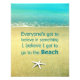 Une photo de plage avec l'étoile de mer et le dicton "Tout le monde doit croire en quelque chose - je crois que je dois aller à la plage".