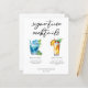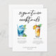 Cette carte de cocktails chic et signature plage propose une typographie noire simple au-dessus de 2 boissons balnéaires et leurs ingrédients pour votre bar mariage côtier. Un joli dessin de Blue Lagoon et Pina Colada ajoute une touche cool à votre menu de bar. Complétez avec les noms du couple et la date de leur réception.
