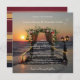 Une belle faire-part de mariage avec une arche avec voiles et roses sur la plage. Un coucher de soleil et des lanternes vintages avec des lampes à cordes ajoutent à l'atmosphère romantique. Sur le dos se trouve un arrière - plan peint artistique aux rayures dorées.