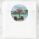Montage photo rond d'un parasol en chaume et de deux chaises longues sur une plage de sable blanc dans un luxueux resort en bungalow surplombant l'eau dans le lagon bleu clair de l'île pacifique de Bora Bora, près de Tahiti en Polynésie française.