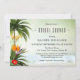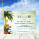 Invitation à la douche nuptiale avec une scène de plage tropicale avec palmiers, lanternes festives et fleurs colorées, donnant sur un océan pétillant vert.