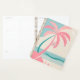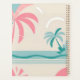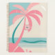 Ce design tropical présente un design minimaliste mais dynamique, avec des palmiers roses pastel et turquoises, face à une plage sereine et un arrière - plan de l'océan. L'oeuvre met en valeur des lignes lisses et propres, avec les formes arrondies des arbres qui complètent les vagues calmes et les nuages du ciel. Au centre de la conception se trouve une zone en forme de carré, surlignée en rose, où les initiales peuvent être personnalisées (actuellement "SG"). Dans l'ensemble, la palette de couleurs est composée de tons doux et muets, rose, turquoise et crème, évoquant une ambiance tropicale détendue, plage.