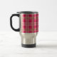 Une tasse de professeur comportant le logo de l'école rose à l'intérieur d'un carré blanc avec l'équilibre rose. L'arrière - plan est plaid rose.