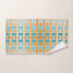 Cette serviette est revêtue d'un plaid orange-turquoise sur un champ de blanc.
