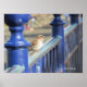Vogel sitzt auf einem Zaun. Ein brauner Spatzen schmiedet sich auf dem Oberband des blauen Eisenzaunes. Die Feldtiefe ist in diesem Foto offensichtlich.