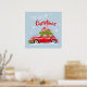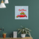 Plakate für frohe Weihnachten, mit einer niedlichen Illustration eines festlich dekorierten Autos mit Tannenzweigen und Kisten mit Geschenken auf dem Dach.