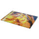 L'oeuvre abstraite de cette planche à découper de 15"x11" a été réalisée à partir d'une photo de closeup originale de HomeWare de gouttes de pluie sur un plante de palmier de corail. Le design photo est dans des couleurs tropicales ensoleillées, jaune vif, rose, orange, terre cuite, bleu et blanc.