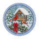 Une paire de Cardinaux rouges du Nord se perche sur une palissade blanche recouverte de neige, ornée d'une guirlande de Noël et d'un arc rouge vif. Ils se régalent d'une mangeoire d'oiseaux d'hiver décorée de cloches de Noël, de rubans et de saints. Oeuvre réaliste créée par l'artiste faunique Crista S. Forest.
