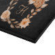 Planche à découper personnalisée avec fleurs en noir, marron et pêche. Disponible en tailles rectangle et cercle.