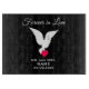 Cette planche à découper Forever in Love présente une belle colombe blanche portant un coeur, et un texte personnalisable qui a été fixé contre un arrière - plan noir. Les trois dernières lignes de l'article peuvent être personnalisées avec vos informations de mariage.