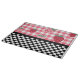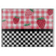 La conception de la planche à découper à thème du printemps/été est fantasque avec la moitié supérieure des fraises rouges et roses sur en vichy rose et la moitié inférieure du damier noir et blanc.