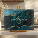 Agate bleu turquoise élégante taillée avec parties scintillant en faux or. Personnalisez-le avec votre initiale monogramme en police décorative couleur or et votre nom en écriture manuscrite blanche.