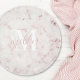 Une planche à découper en verre rond, moderne et chic, est conçue sur mesure, avec votre monogramme stylisé et votre nom de famille sur l'arrière - plan en marbre rose.