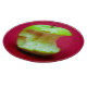 Photo d'une grosse pomme verte against red background. The big bite has been taken out of the apple.