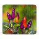 Ces piments de piment brillants et colorés, la variété 'Tigre pourpre', font un design intéressant pour cette planche à coupe en verre