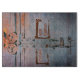 Porte en métal gris turquoise avec serrures, roues, texte et un peu de ruban déchiré. Photographié dans un bâtiment ancien au Pays de Galles, édité. Par Alexandra Cook alias Linandara.