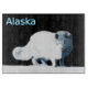 Un tableau numérique d'un Renard arctique lors d'une nuit polaire brillante. Lecture de texte, "Alaska" apparaît en bleu et blanc brillant.