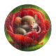 Une souris mignonne et moelleuse dormant paisiblement dans une fleur de pavot rouge vibrante. Les pétales de la fleur sont doux et détaillés, entourant la souris comme un lit douillet. L'arrière - plan est décoré dans des tons verts doux, créant une atmosphère sereine et tranquille, avec une touche de lumière pétillante pour ajouter une touche magique.