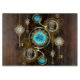 Turquoise lenses with antique watch with brass gears and golden keys on rusty, brown background. Steampunk style.