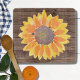 Cette planche à découper rustique est décorée d'un tournesol jaune aquarelle sur un arrière - plan en bois de grange. Aquarelle originale © Michele Davies.